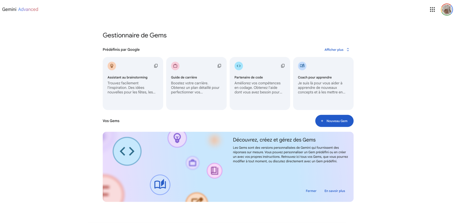 Google propose également des Gems préconfigurés pour différentes tâches :