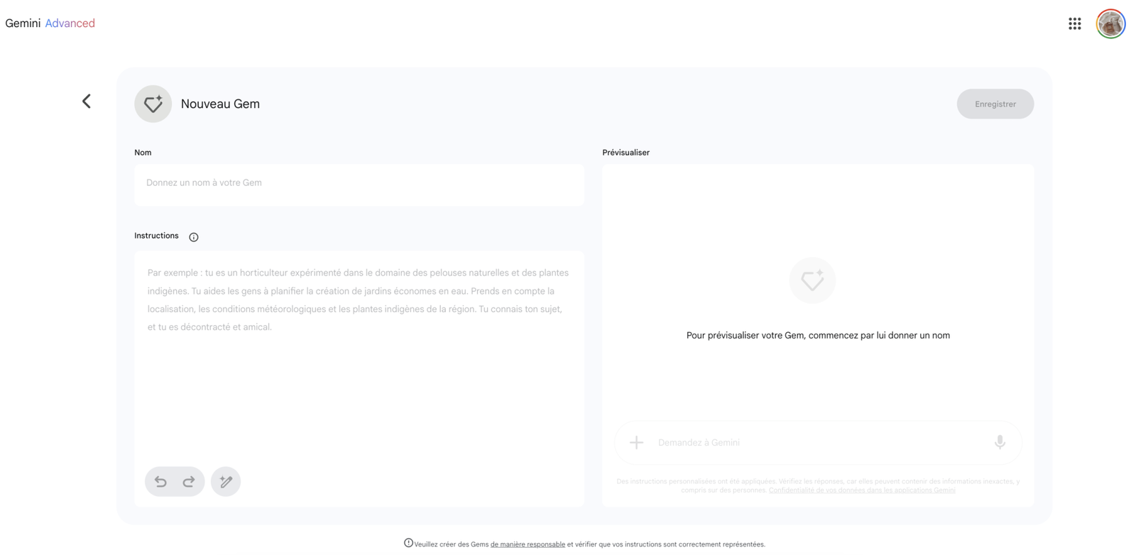 Pour en créer un, il suffit d’accéder au Gestionnaire de Gems, à droite et de cliquer sur Nouveau Gem, de lui donner un nom et de définir ses instructions.