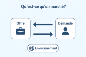 Un marché est le lieu (réel ou virtuel) où se rencontrent l’offre (les producteurs, vendeurs) et la demande (les consommateurs, acheteurs) pour échanger des biens, services ou capitaux à un prix déterminé.